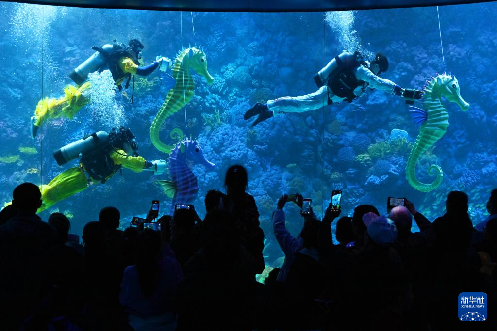 春节假期,青岛极地海洋公园推出水下“赛马”贺新春演艺项目,将传统年俗与海洋特色文化相结合。潜水员操控海马道具在水中相互追逐,欢快趣味的表演令游客耳目一新。