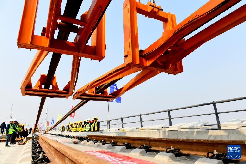 3月10日,济(南)滨(州)高铁正式进入全线铺轨作业阶段。济滨高铁是津潍高铁和山东省快速铁路网鲁北通道的重要组成部分,也是国家铁路网“八纵八横”高速铁路网主骨架京沪、青太通道的重要联络线,设计时速350公里。新华社记者 郭绪雷 摄