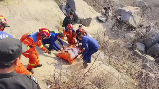 随后,消防救援人员根据现场情况实施救援,首先将被困人员抬至多功能担架,并对其施行保护措施,防止转移过程中造成二次伤害,由于现场野路崎岖、坡度较大,途中多次使用绳结索降,稳步护送向山下转移,经过一番紧张的救援,成功将被困人员转移至山下安全区域,并交由现场120医护人员送往医院进行后续治疗。