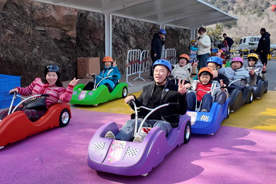 游客乘坐特制滑车,可自由控制速度,在蜿蜒的滑道上感受贴地飞行的快感。全程精心设置的18个惊险弯道,完美复刻了著名的“沂山十八盘”的险峻与刺激 。滑道穿梭于茂密山林与烂漫花海之间,游客在呼啸而过的瞬间,既能体验肾上腺素飙升的激情,又能将沿途苍翠林海与绚烂花景尽收眼底。全程15-20分钟的滑行时间,为各年龄段游客提供了前所未有的动感体验,无疑将成为今春家庭亲子游与年轻客群的爆款选择。