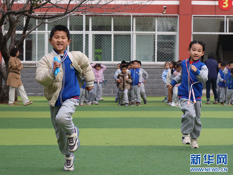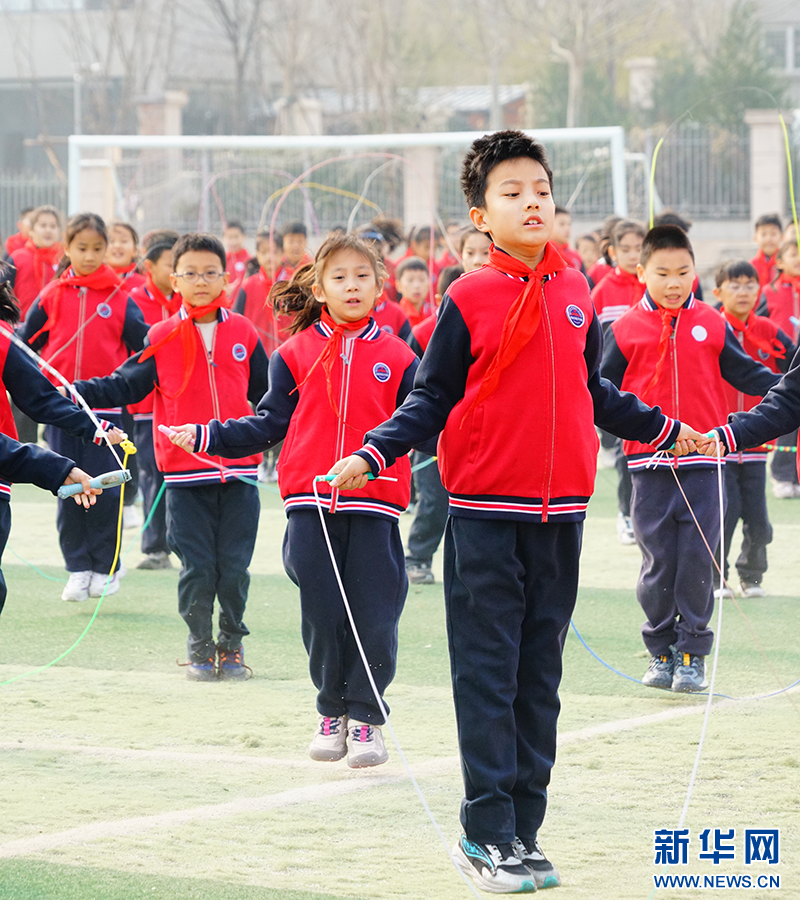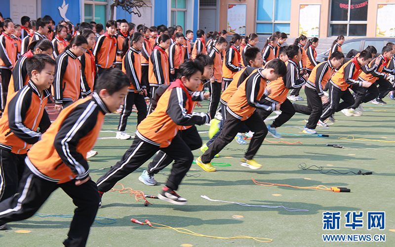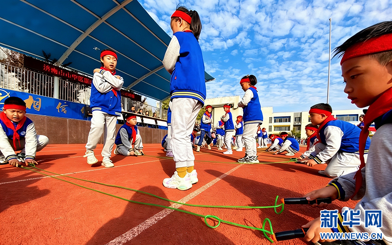 济南市市中区泉海学校小学部推出“体质提升大课间”活动,学生们在跳绳。新华网发