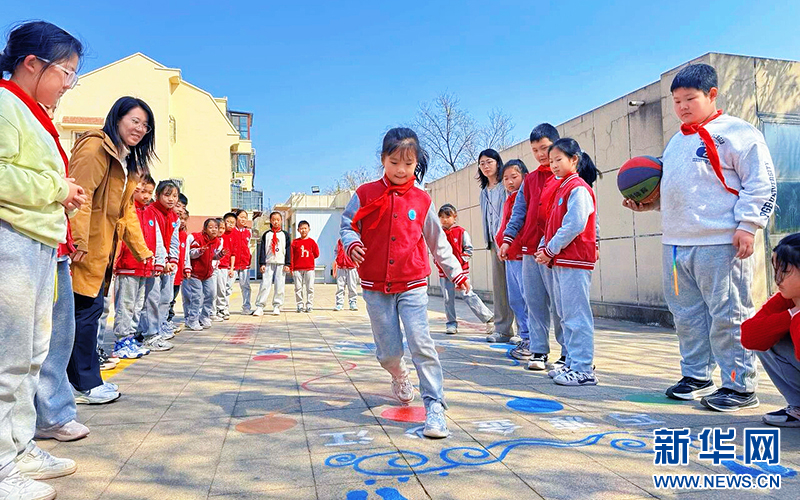 济南市市中区卧龙路小学大课间活动时,学生在玩跳格子游戏。新华网发