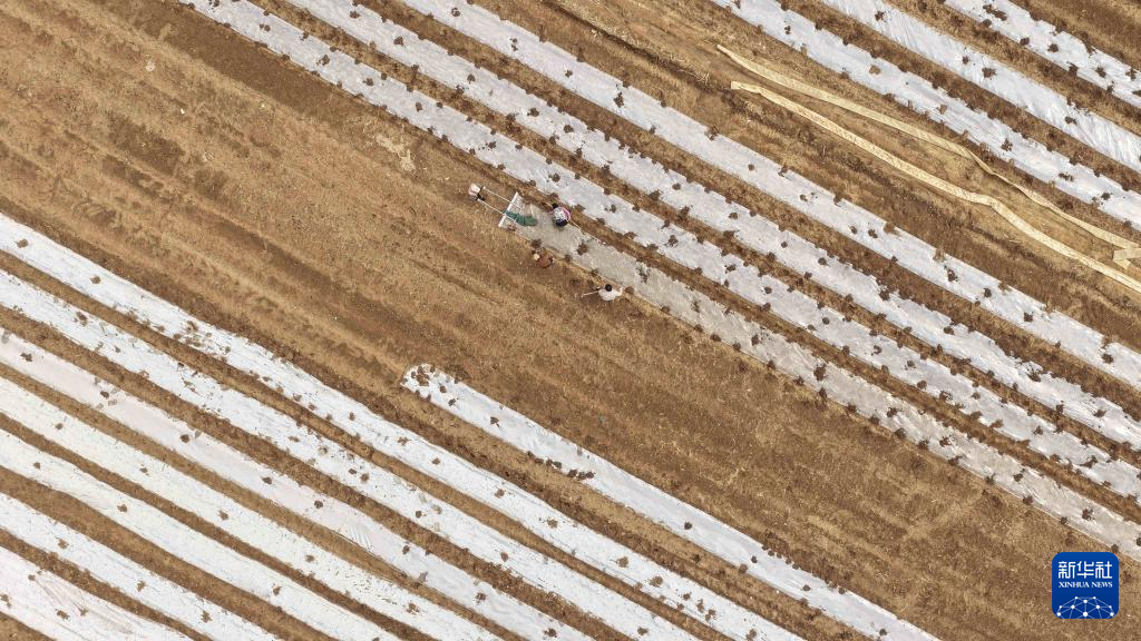 3月23日,在山东省临沂市郯城县郯城街道,农民在田间劳作(无人机照片)。新华社发(张春雷摄)