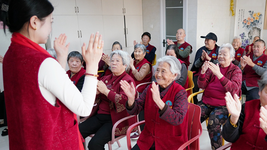 3月25日,在山东省临沂市沂南县妇幼保健院银发公寓,护理人员在带老人们做拍手操。