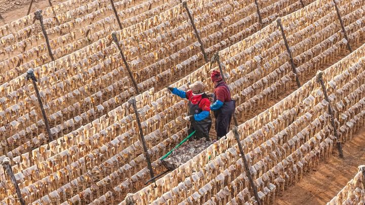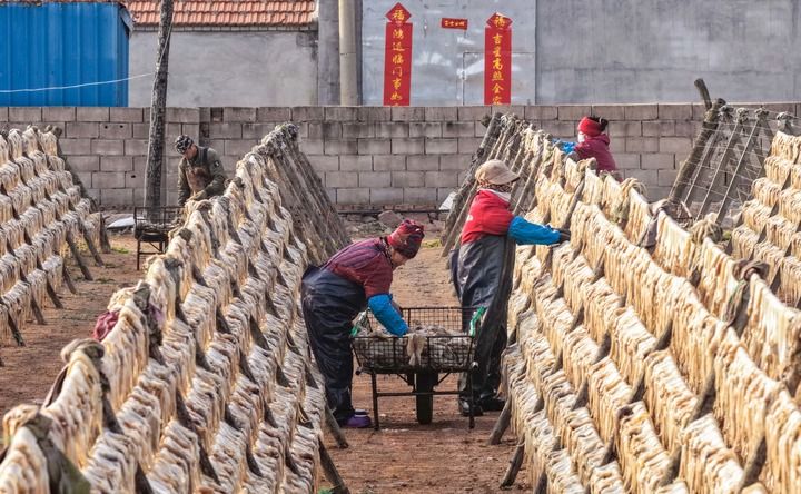 春日晒鲜,在山东省荣成市南部沿海一处晒场,渔民在晾晒鱿鱼。新华社发(李信君摄)