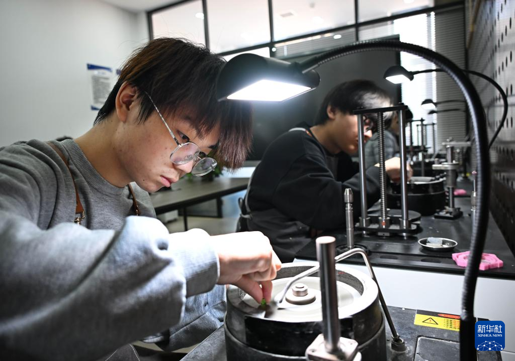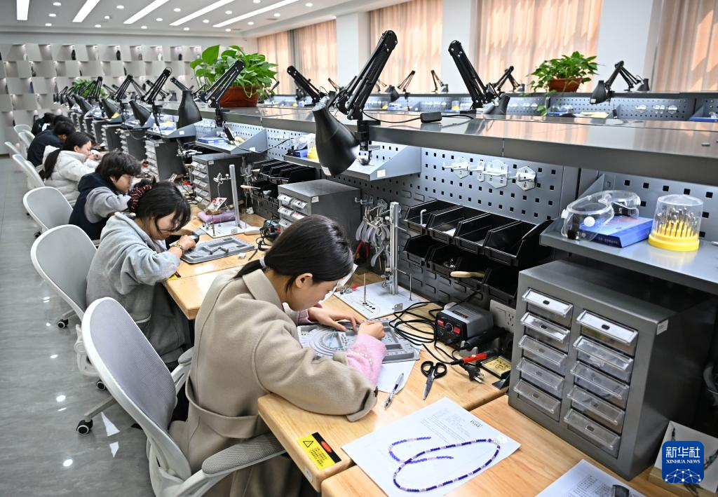 近年来,山东青岛幼儿师范高等专科学校珠宝学院依托校内实训基地和生产性实训平台,将珠宝行业全流程实操场景搬进课堂。学生在这里不仅能学习珠宝专业理论,练习宝玉石鉴定、加工、琢磨等传统技艺,还能学习AIGC首饰设计、3D建模、数码影像、直播带货等数字化技能,参与企业真实订单生产、产品质监检测等实战环节,掌握当下珠宝行业所需的复合型技能。新华社记者 李紫恒 摄