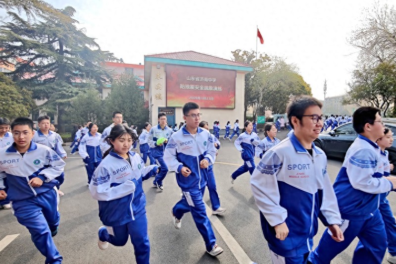 “低头、护头,沿路线快速疏散!”近日,急促的警报声在济南中学校园响起,两千余名师生迅速响应,按预定路线有序撤离至操场,全程紧张而井然有序。这是该校每月一次的“安全必修课”,也是其坚持“常态化、规范化、实战化、长效化”的“四化”演练模式的生动缩影。
