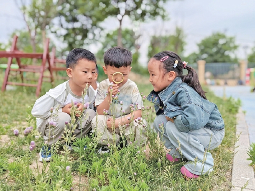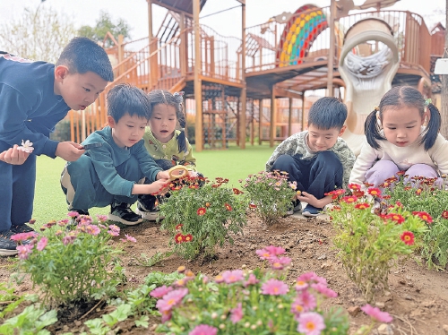 济南市槐荫区礼乐佳苑幼儿园清源分园的孩子们在观察花卉。