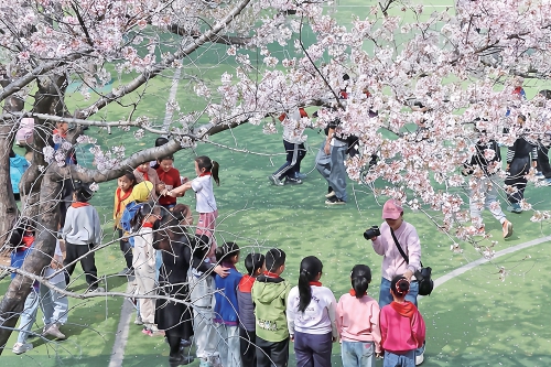 济南市舜玉小学的学生和家长在樱花树下合影。