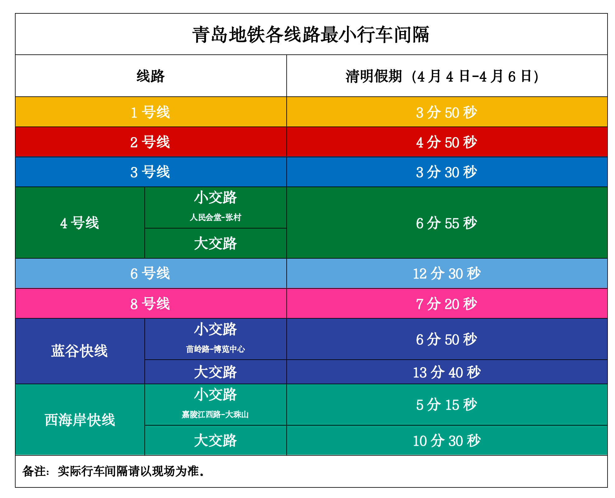 清明假期(4月4日—4月6日),青岛地铁增加运力投放、缩短候车时间,让您的赏花之旅更舒心、更从容。清明假期各线路具体最小行车间隔安排如下。