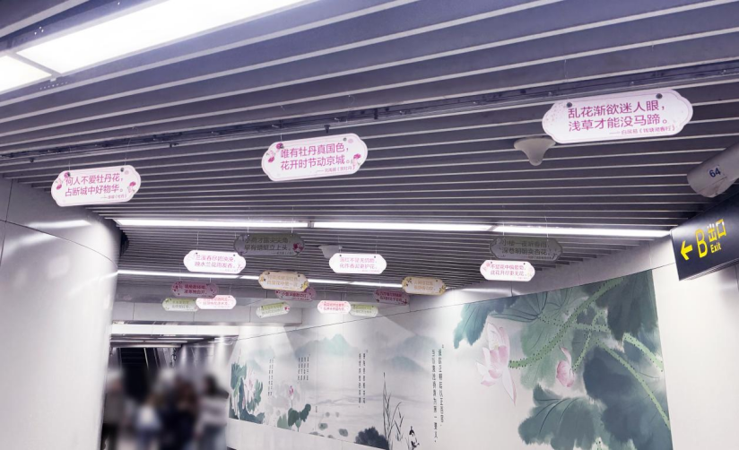A、B出入口通道以烂漫春花为灵感,悬挂春日主题卡片,镌刻经典咏花诗句,步履之间便可邂逅诗意与美好。