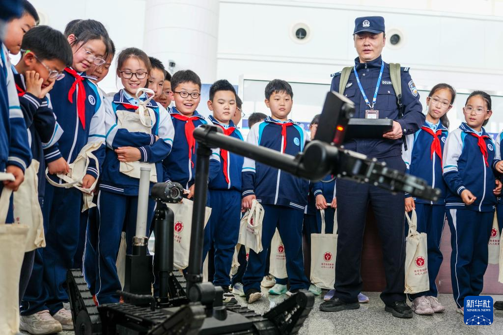 4月13日,在济南国际机场,学生在活动现场观摩警用装备。新华社记者 朱峥 摄