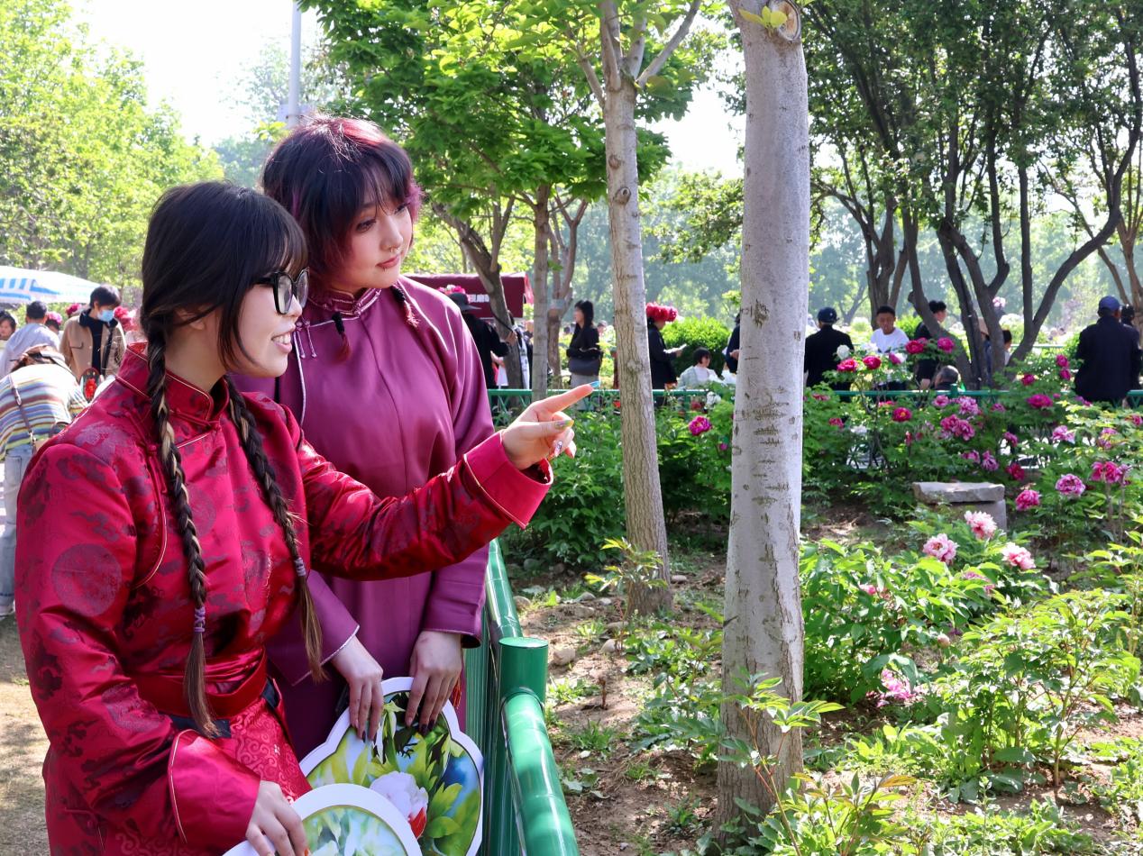 此次活动属2026年菏泽牡丹节会配套活动之一,包括主题游园和共创绘画两部分。上午,在曹州牡丹园国花魂广场,中外学生手持印有花卉图案的特制卡片,依次分享对菏泽牡丹的理解与寄语,讲述花卉背后的文化故事与美好寓意。在讲解员的带领下,中外学子游览曹州牡丹园,观赏雍容华贵的牡丹盛景,感受菏泽深厚的牡丹文化与城市魅力。