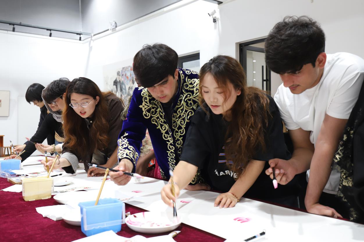 下午,“牡丹传情·共绘芳华”活动在学校美术馆举行。美术与设计学院美术系教师讲解了菏泽牡丹的悠久历史、艺术寓意,以及国画牡丹的基本绘画技法。留学生代表分享本国国花的象征意义与文化内涵。师生发出倡议,携手搭建中外花卉文化交流平台,共筑花卉文化共同体。中外学子开展绘画创作,美术系教师全程指导。大家挥毫泼墨、交流创意,在互动中增进情谊,在碰撞中凝聚灵感,现场氛围融洽热烈。