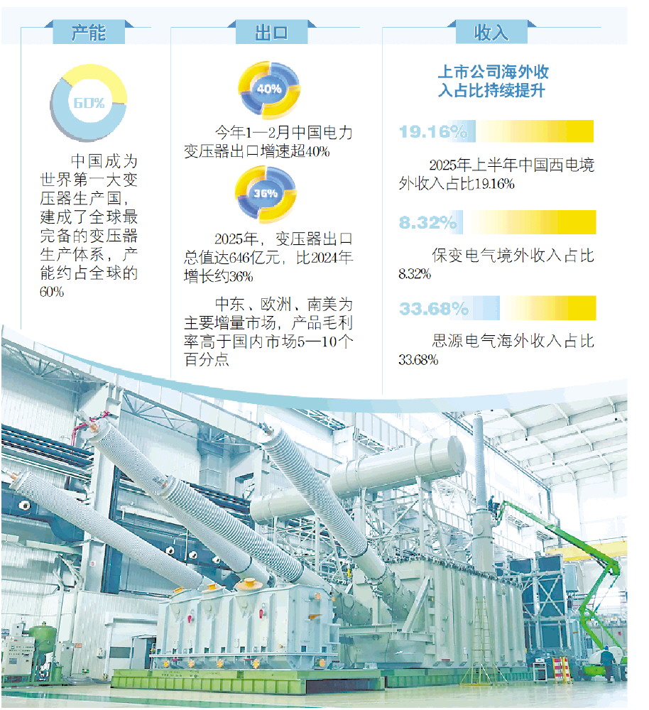 记者查阅多家上市公司信息注意到,特变电工、思源电气等企业海外订单同比显著增长,中东、欧洲、南美为主要增量市场,产品毛利率高于国内市场5—10个百分点。从数据看,上市公司海外收入占比持续提升,去年上半年中国西电境外收入占比19.16%,保变电气境外收入占比8.32%,思源电气海外收入占比33.68%。