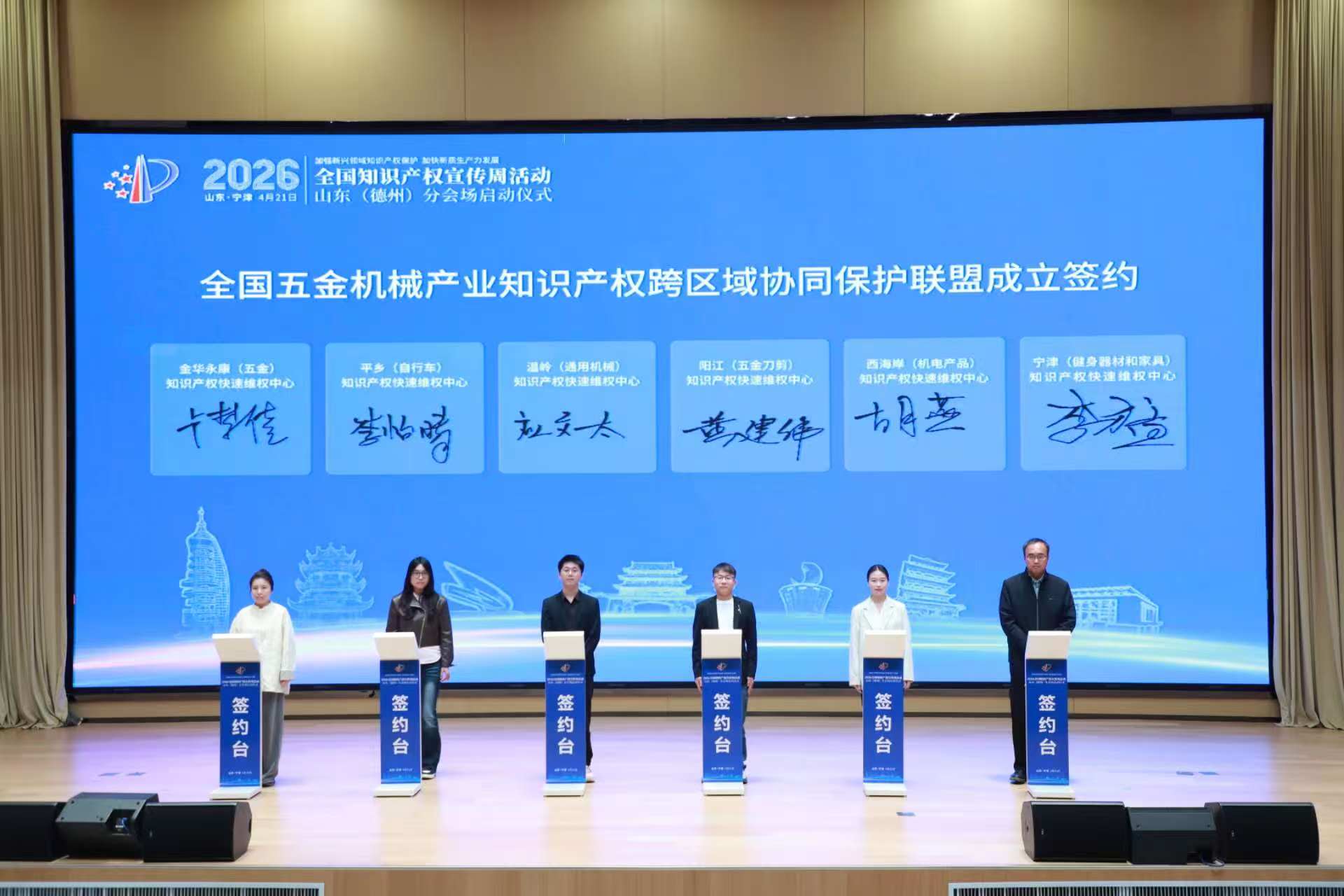 签约环节成果丰硕,多项合作落地见效。全国五金机械产业知识产权跨区域协同保护联盟成立,6家国家级知识产权快速维权中心现场签约,构建起跨区域、高效率的知识产权保护体系;山东知识产权运营中心与宁津县政府签署山东省体育产业专利池共建协议,迈宝赫、罗赛罗德、宝德龙等7家本土企业签署入池协议,整合产业链专利资源、提升产业核心竞争力;河北工业大学、西北工业大学、济南大学等高校与山东美能达、天之盾、天展等企业达成专利成果转化合作,推动实验室专利技术快速落地转化。