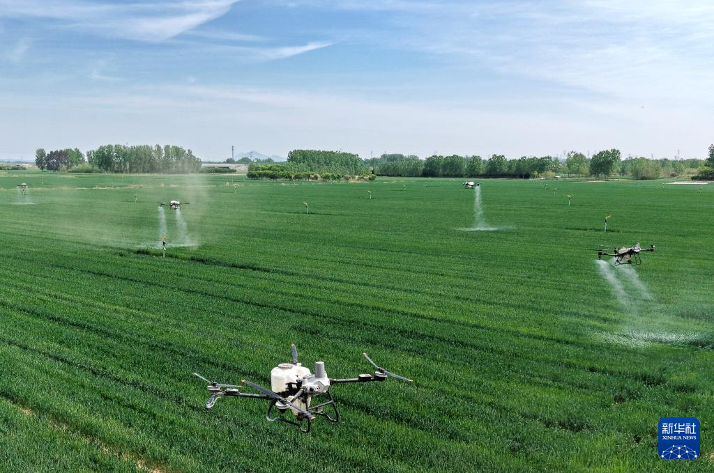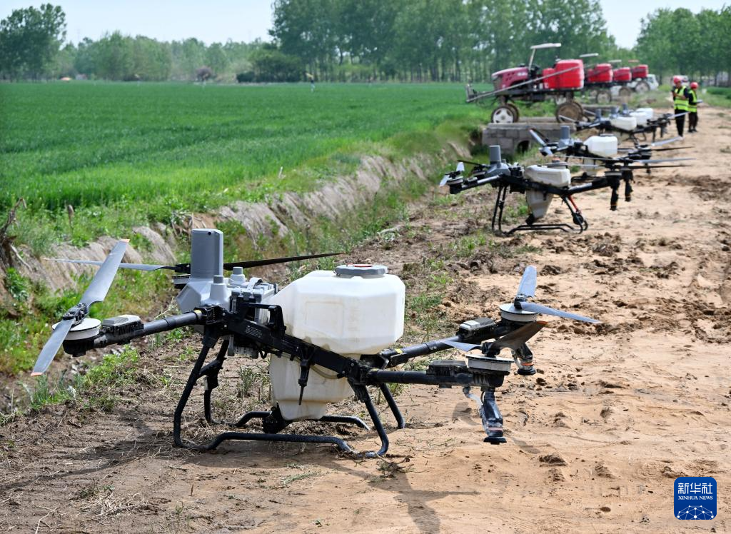 4月28日,在青岛市西海岸新区大场镇绿色增粮先行区,植保无人机准备开展“一喷三防”作业。新华社记者 李紫恒 摄