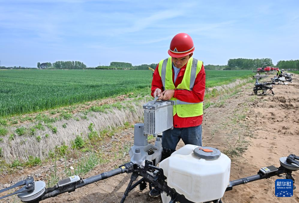 4月28日,在青岛市西海岸新区大场镇绿色增粮先行区,一名飞手为植保无人机更换电池。新华社记者 李紫恒 摄