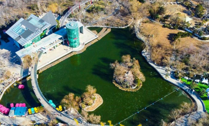 三九寒潮来袭,济南映日湖湖面封冻如翡翠