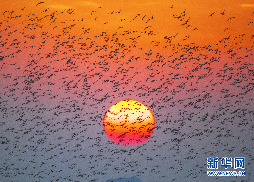 落日下,鸟儿集结飞翔。新华网发(陈昌伦 摄)