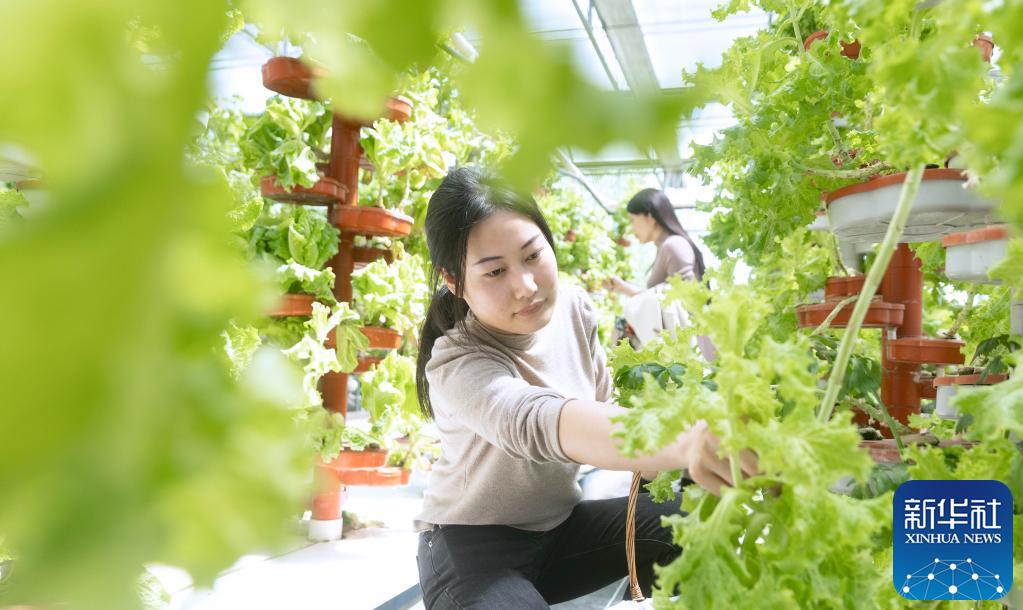 4月16日,游客在山东临沭县史丹利农业科技示范园采摘生菜。