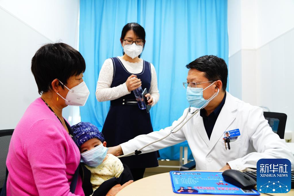 4月19日,在胜利油田中心医院垦利院区,儿科主任医师张志明为患儿看病。