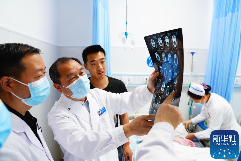 4月19日,在胜利油田中心医院垦利院区,神经外科副主任医师王久忠(左二)在查房问诊。新华社记者 郭绪雷 摄