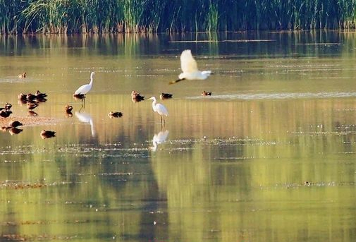 济西湿地:水鸟翩跹戏碧波 生态画卷入眼来