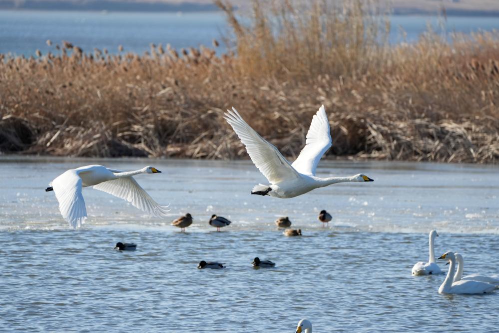 大批大天鹅在山东荣成越冬