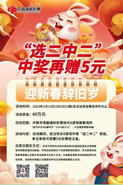 济南市福利彩票中心快乐8游戏“快乐8•迎新春辞旧岁”促销活动火热进行中,“选二中二”中奖再送5元彩票投注金。
