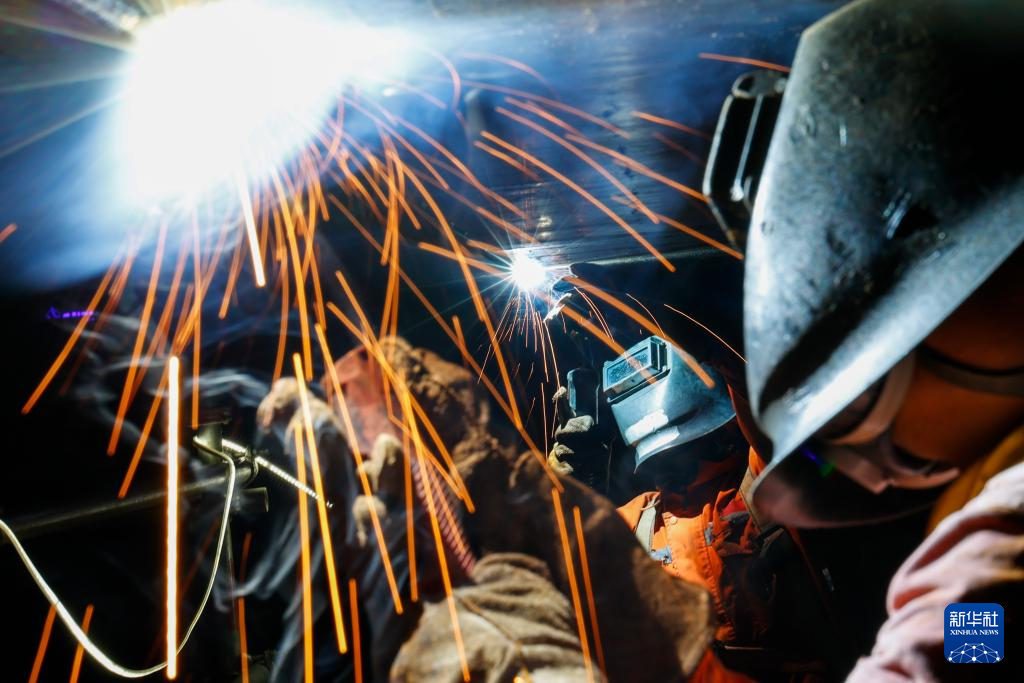 7月9日深夜,工人在渤中19-6凝析气田一期项目中心平台作业现场施工。新华社发(杜鹏辉 摄)