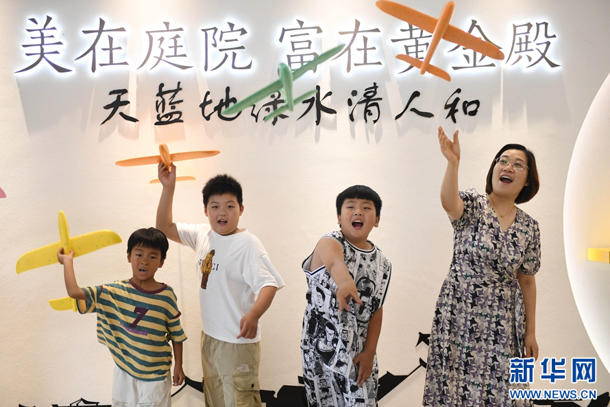 在山东省郯城县马头镇黄金殿村“留守儿童快乐驿站”,辅导老师赵凤娟(右一)和孩子们一起做“放飞”游戏。新华网发(房德华摄)