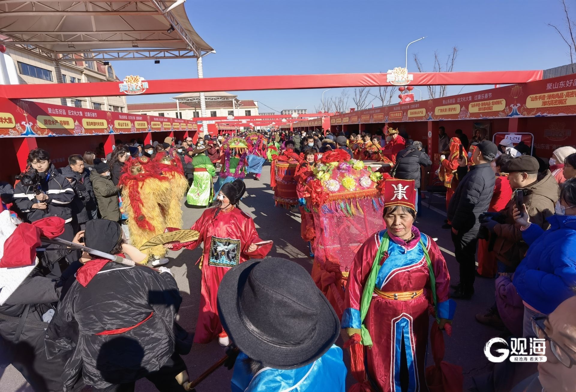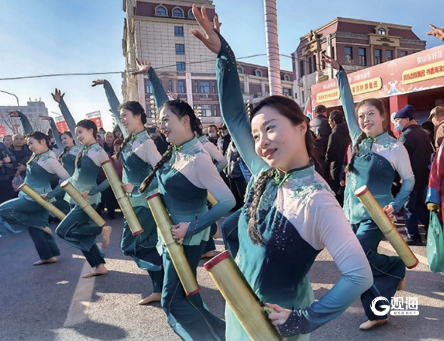 “海洋大集”是群众的大舞台,基层、社区、村居、文化场所的广泛参与,让“海洋大集”真正成为老百姓期待的新春优质文化供给。当有着300多年历史的国家级非物质文化遗产胶州秧歌遇上有着600多年历史的非遗鱼皮鼓,来自城阳村社区的“渔家姑娘”们一出场,现场的气氛愈发热烈起来。