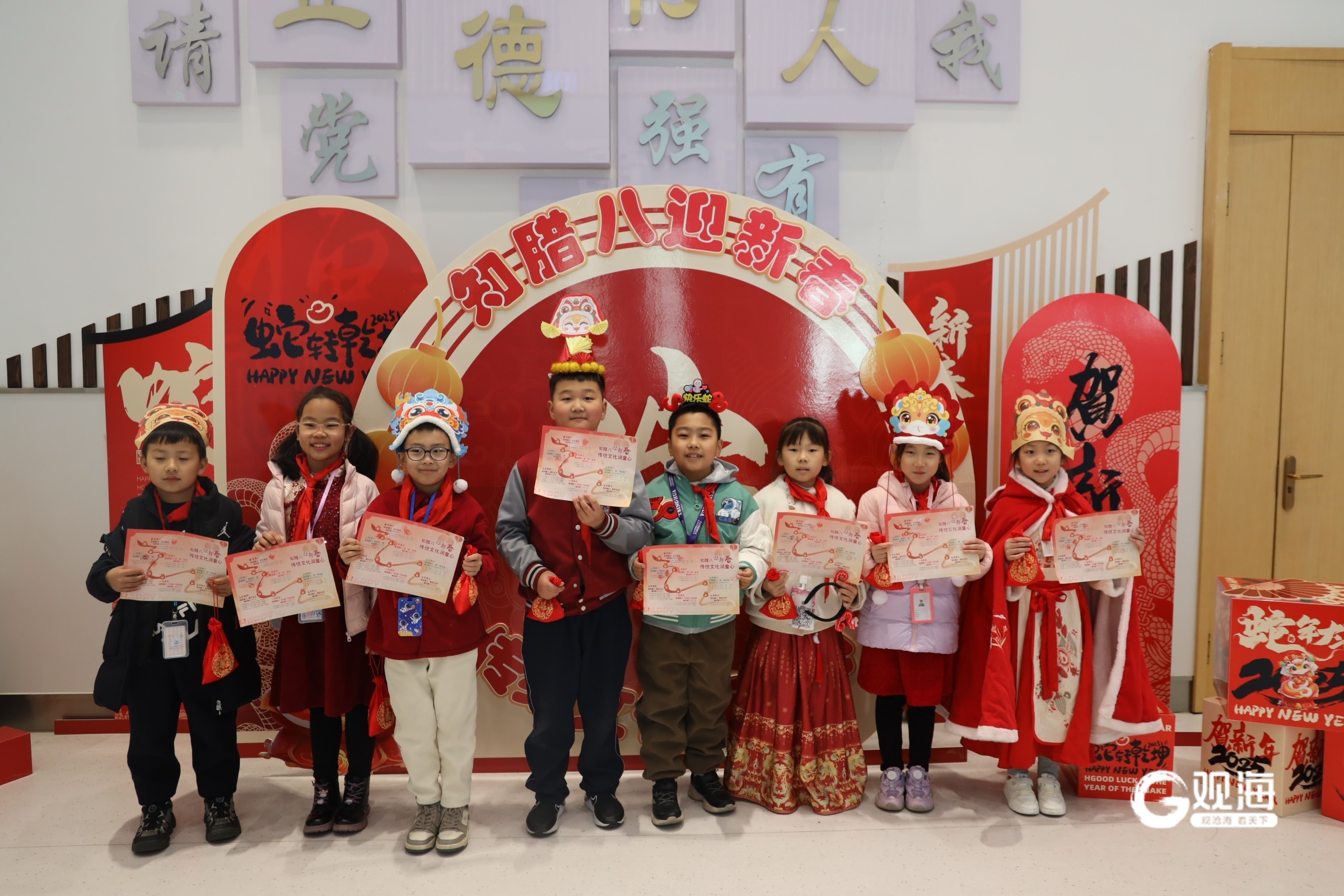 头戴醒狮帽、虎头帽,身着马面裙、汉服等传统服饰……胶州市瑞华实验小学面向一二年级开展“知腊八迎新春传统文化润童心”阶段性无纸化综合素养测评活动。学校依据学生核心素养、课程标准和学情,探索无纸化测评新路径,开启了评价机制的改革探索。