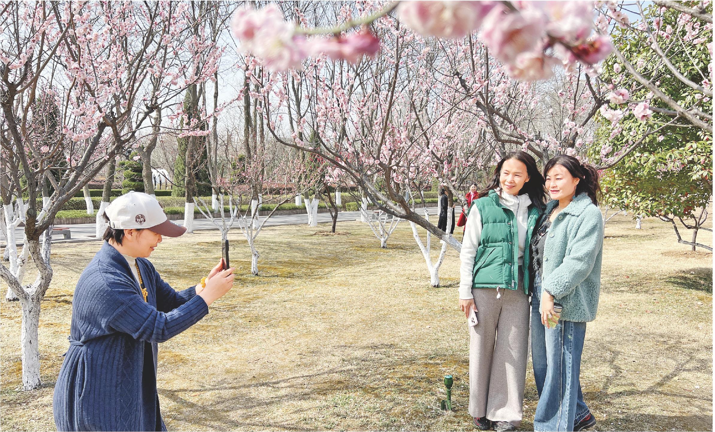 近日,山东临沂雕塑公园里梅花盛开,吸引不少市民前来赏花。