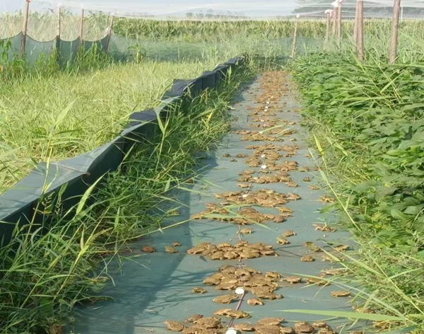 蟾蜍幼苗蝌蚪在帆布鱼池内养殖,进化为幼蟾后,撤掉帆布鱼池,为了给蟾蜍遮阴招虫,在养殖区域再种植可以榨油的经济作物油葵,而蟾蜍的排泄物又可用作其肥料,两者生长周期相近,形成良性循环。目前,蟾蜍日渐壮硕,油葵籽实饱满,在这里,一地两用,互惠互利,实现了土地效益翻倍,是绿色环保的生态养殖。