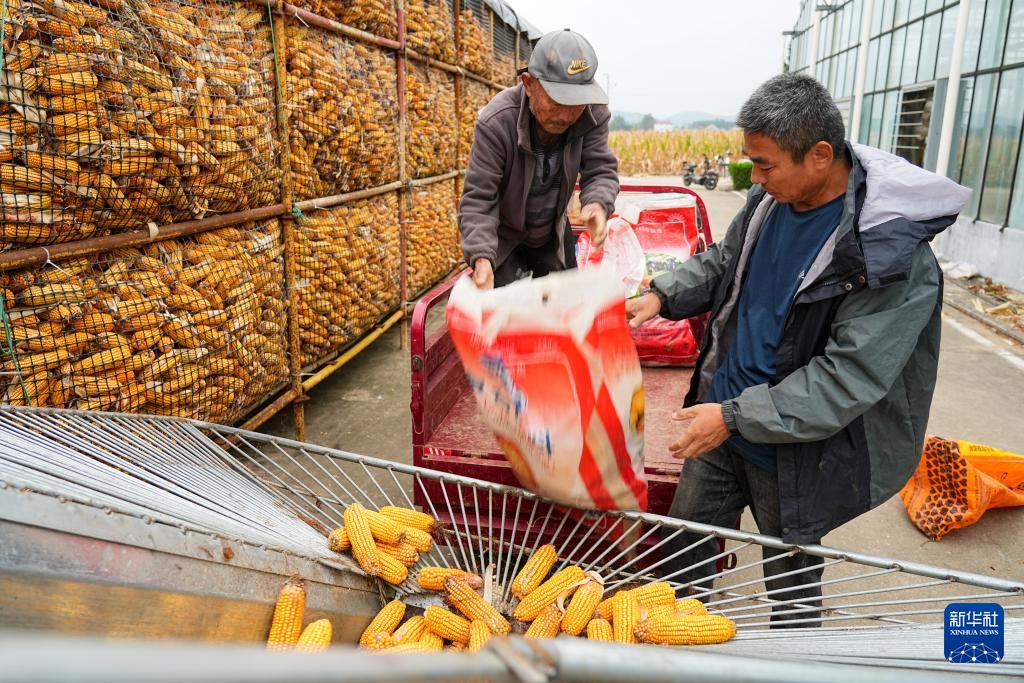 10月11日,沂南县张庄镇种粮大户刘增升利用大棚排风扇干燥收获的玉米。