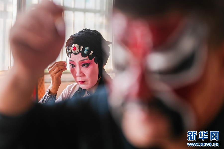 10月27日,山东省邹平市焦桥镇董家村文化大院,演员化妆准备为老人们演出传统京剧《铡美案》。 新华网发(董乃德 摄)