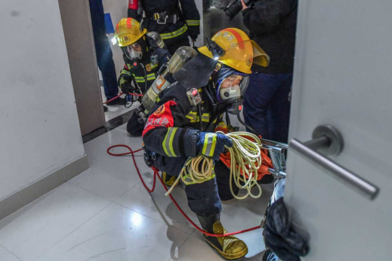 现场救援迅速展开。侦察组利用无人机构建立体网络,实时回传火场信息;灭火攻坚组抵达着火层下区,架设水枪阵地遏制火势;搜救组携带热成像仪、生命探测仪等专业设备深入浓烟区逐户搜救;举高消防车、壁挂水幕器、系留无人机与室内力量形成“内外夹攻”之势。经多轮扑救,所有被困人员被成功转移,“大火”被彻底扑灭,演练圆满结束。
