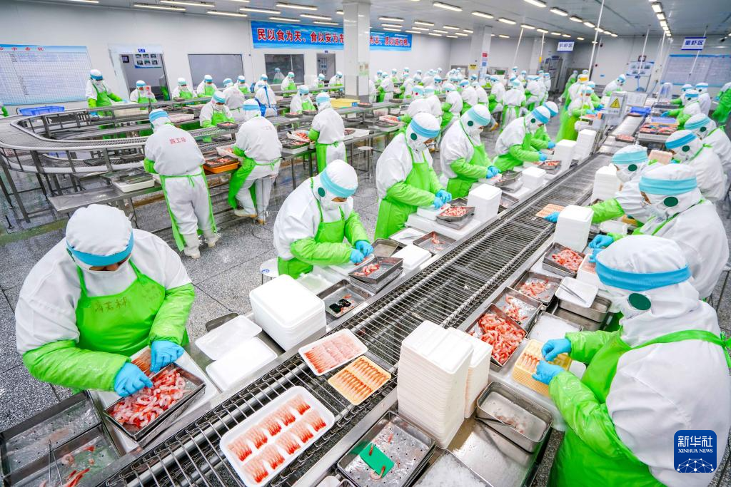11月10日,山东日照美佳集团的工作人员将甜虾产品装盘。