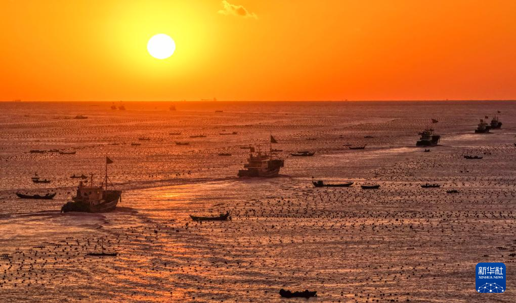 11月11日,在山东青岛西海岸新区海域,养殖户在收获牡蛎和扇贝(无人机照片)。