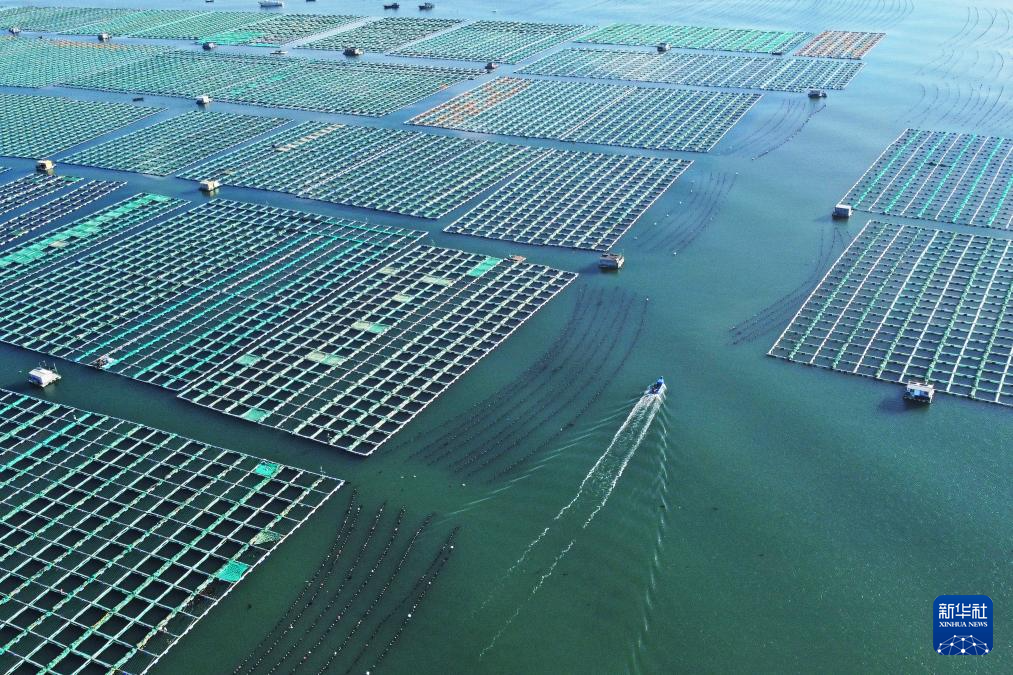 11月10日,在山东省荣成市桑沟湾海洋牧场,养殖工人在养殖区穿梭作业(无人机照片)。