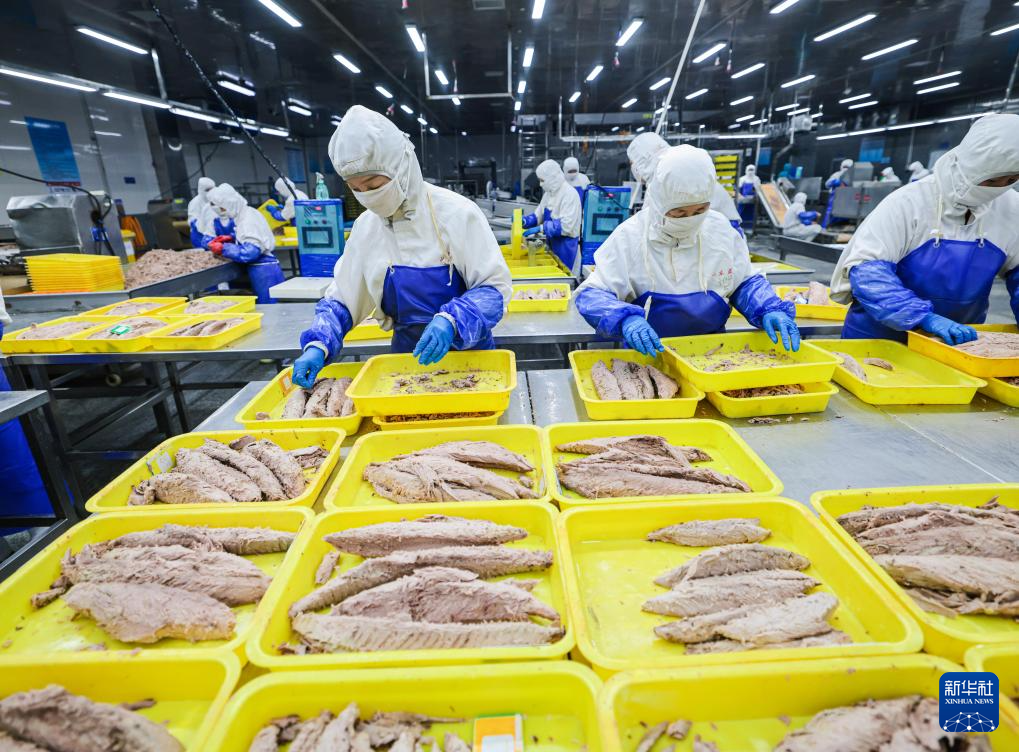 11月10日,山东省荣成市俚岛镇一家水产品加工企业的工人在加工鳕鱼制品。