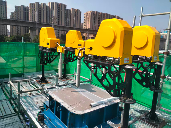 在立柱施工中,这位机器人“振捣大师”展现出惊人效率:将单根立柱振捣时间缩短50%,施工效率提升100%,高空作业人员减半,饰面混凝土施工质量达行业领先水平。
