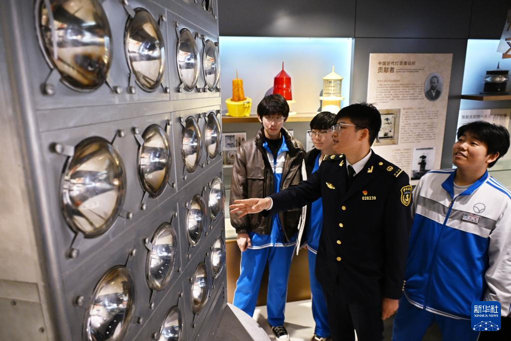 12月10日,青岛航标处工作人员在团岛灯塔博物馆内为学生讲解。新华社记者李紫恒摄