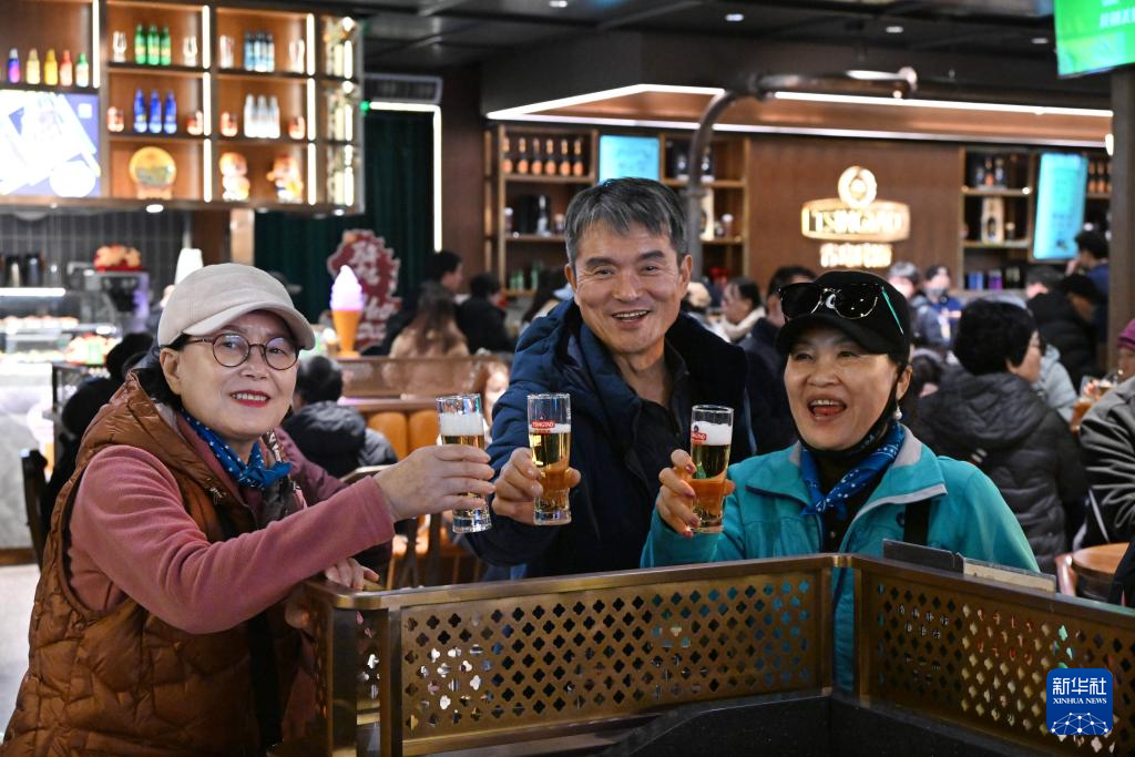 12月31日,几名韩国游客在青岛啤酒博物馆内品尝啤酒。
