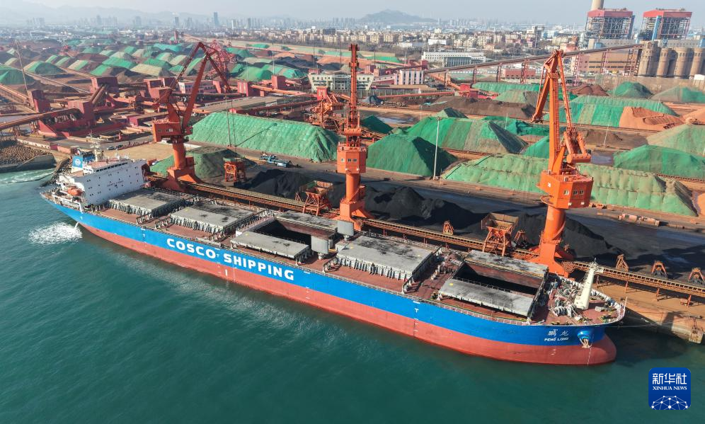 1月5日,在青岛港前湾港区86泊位,“鹏龙”轮在进行卸煤作业(无人机照片)。新华社记者 李紫恒 摄