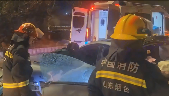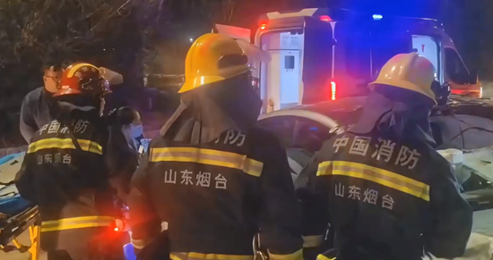 山东烟台:雪夜出车祸两人被困,消防紧急救援