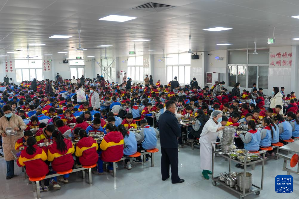 如今,学校建立了全流程管理制度,每个环节都有专人负责,工作人员也全部从学生家长中聘用。餐厅后厨清洗、消毒、烹饪设备一应俱全,“明厨亮灶”让食材处理、加工全过程透明可监督,保障滩区娃健康成长。新华社记者 朱峥 摄