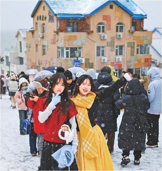 1月18日,威海迎来降雪,威海高新区火炬八街游客熙攘,乐赏雪景。(通讯员 朱春晓)